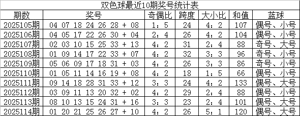 双色球第2025114期奖号为:01、20、21、25、26、27+10。其中红球和值为120,奇偶比为4:2,大小比为5:1,蓝球为偶数、大号。
