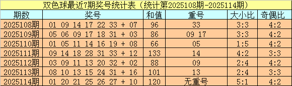 开奖回顾:双色球第2025114期奖号为:01 20 21 25 26 27 + 10,红球和值为120,奇偶比为4:2,大小比为5:1。蓝球开出偶数。